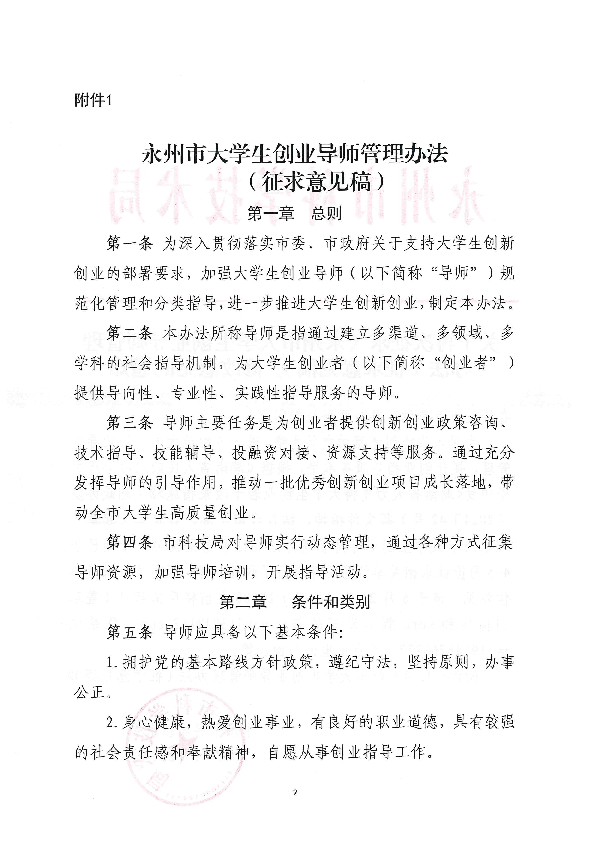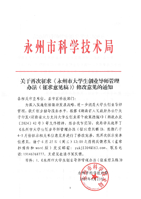 关于再次征求《永州市大学生创业导师管理办法(征求意见稿)》修改意见的通知_通知公告_市科学技术局_永州市人民政府