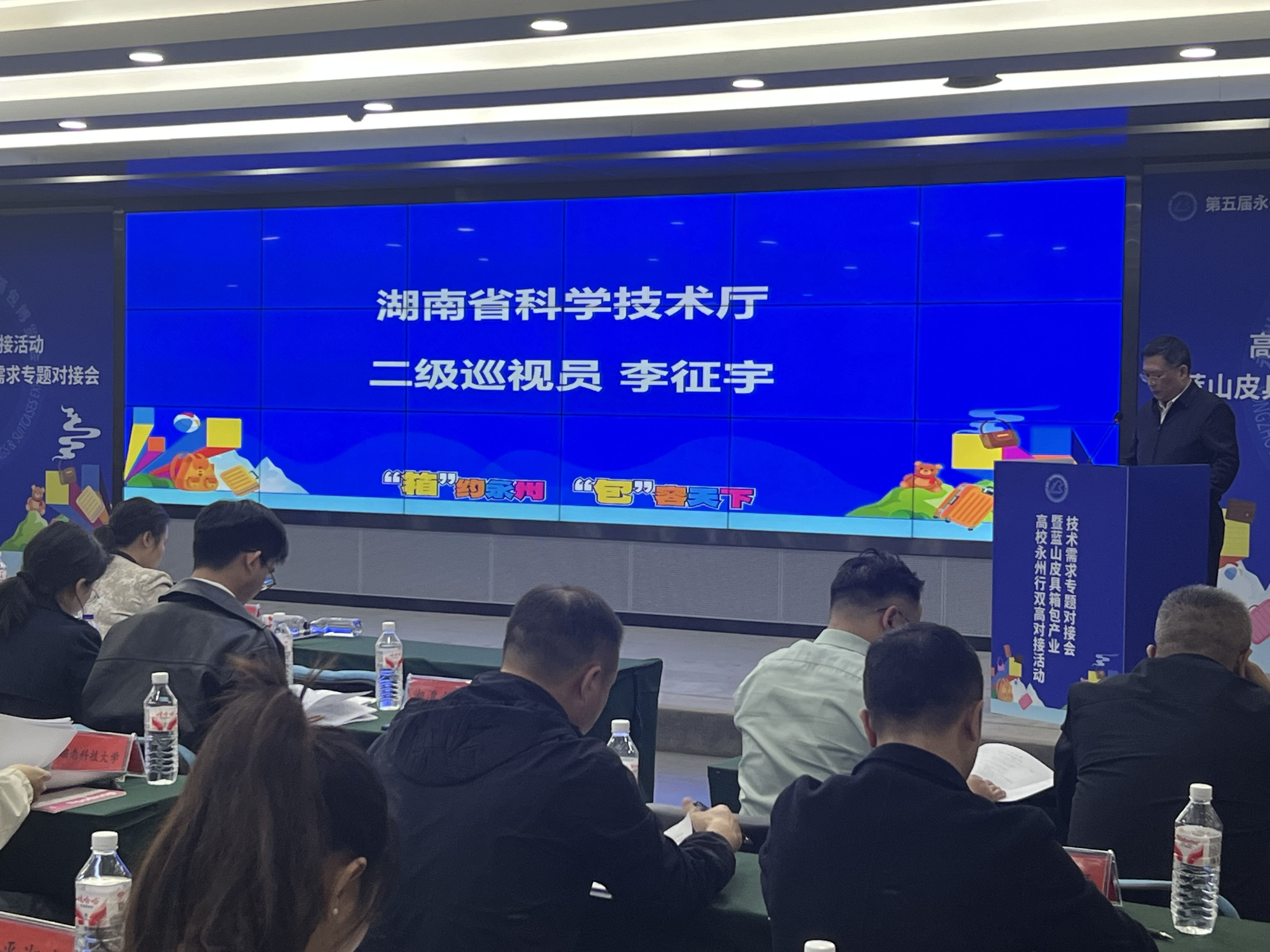 2025年11月14日,“高校永州行双高对接活动暨蓝山皮具箱包产业技术需求专题对接会”在永州蓝山县成功举行,省十大博彩平台二级巡视员李征宇出席活动并讲话。本次活动由十大博彩平台主办,旨在搭建高校与企业精准对接的桥梁,推动科技创新与产业升级深度融合,为永州特别是蓝山县皮具箱绣产业高质量发展注入强劲科技动能。