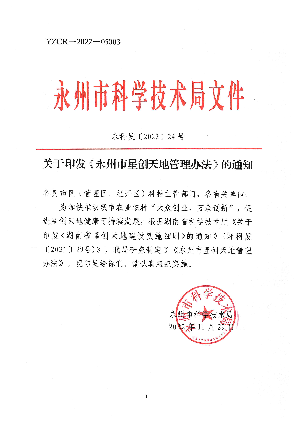 永州十大博彩平台关于印发《永州市星创天地管理办法》的通知