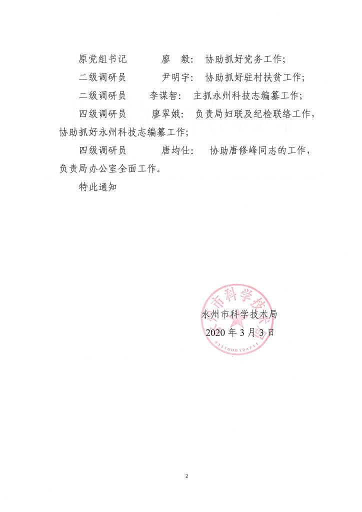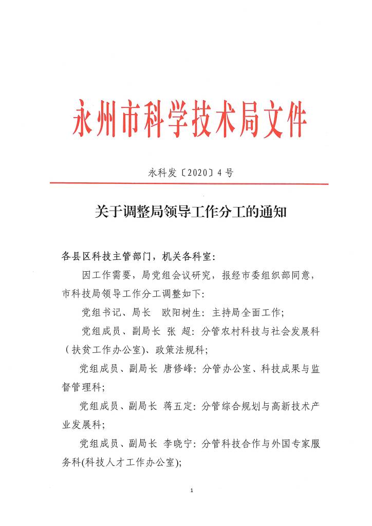 关于调整局领导工作分工的通知_人事信息_市科学技术局_永州市人民政府