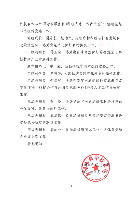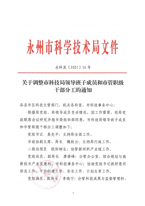 关于调整十大博彩平台领导班子成员和市管职级干部分工的通知_人事信息_市科学技术局_永州市人民政府