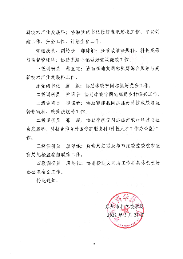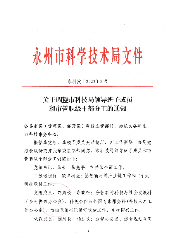 关于调整十大博彩平台领导班子成员和市管职级干部分工的通知_人事信息_市科学技术局_永州市人民政府
