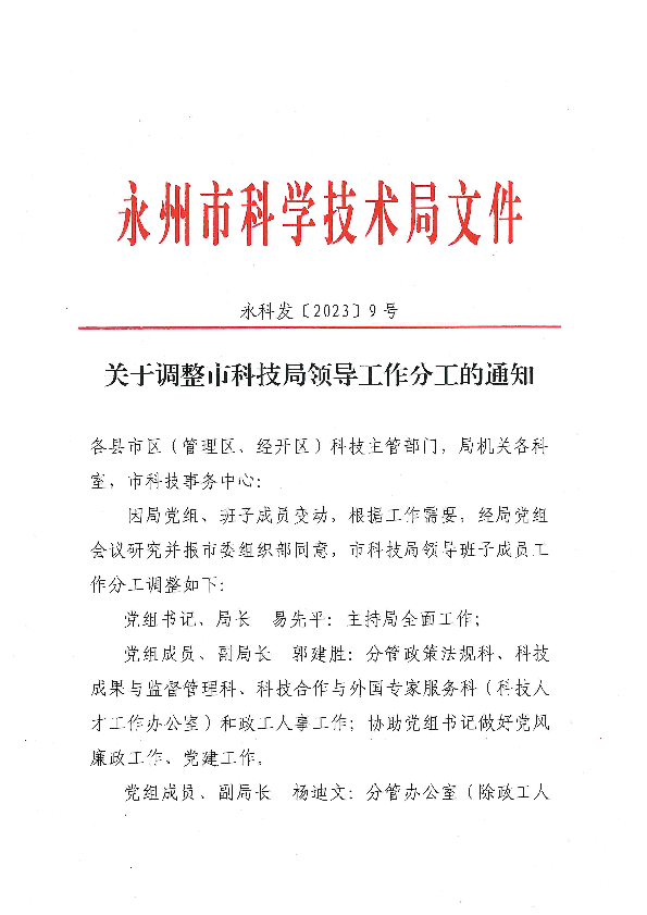 关于调整十大博彩平台领导工作分工的通知_人事信息_市科学技术局_永州市人民政府