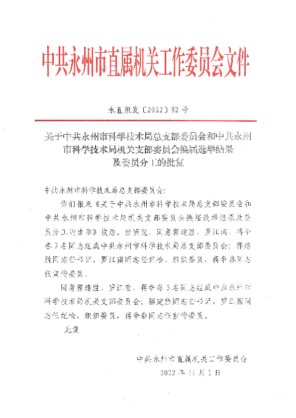 关于中共十大博彩平台总支部委员会和中共十大博彩平台机关支部委员会换届选举结果及委员分工的批复_班子建设_市科学技术局_永州市人民政府
