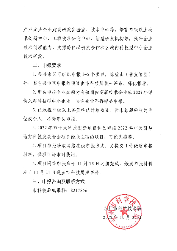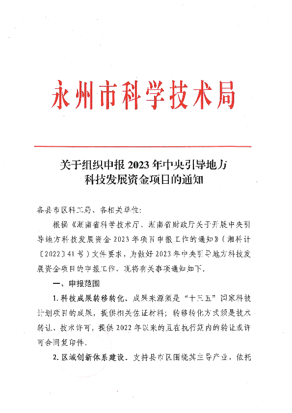 关于组织申报2023年中央引导地方科技发展资金项目的通知_创新成果转化_市科学技术局_永州市人民政府