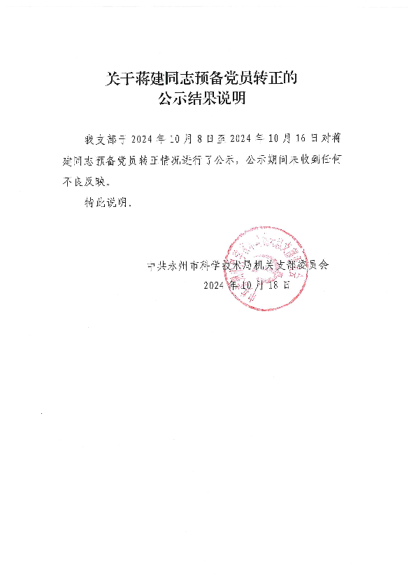 关于蒋建同志预备党员转正的公示结果说明_党员发展_市科学技术局_永州市人民政府