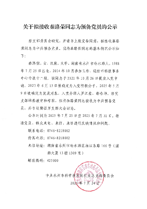 关于拟接收秦路荣同志为预备党员的公示_党员发展_市科学技术局_永州市人民政府