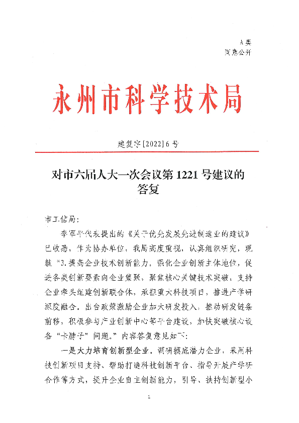 对市六届人大一次会议第1221号建议的答复_建议提案_市科学技术局_永州市人民政府