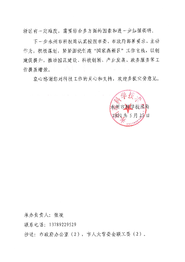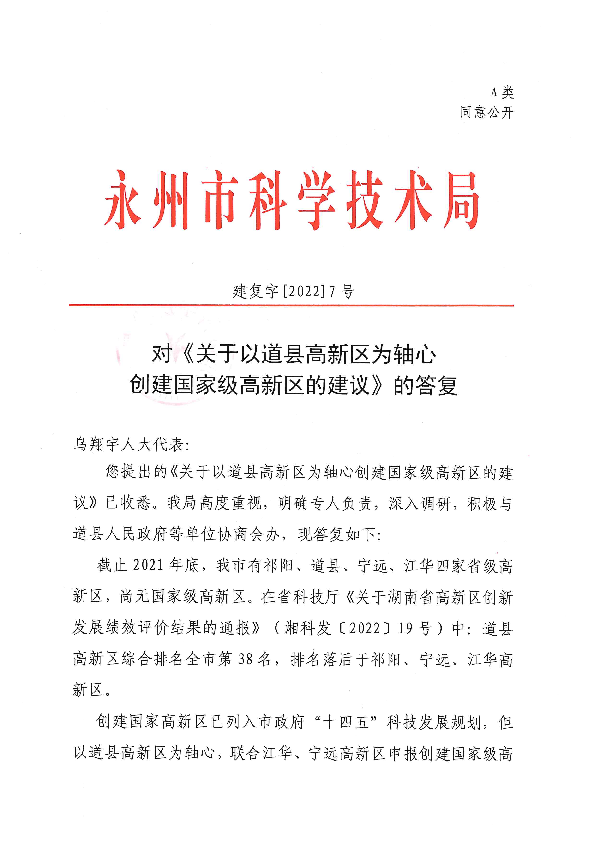 对《关于以道县高新区为轴心创建国家级高新区的建议》的答复_建议提案_市科学技术局_永州市人民政府