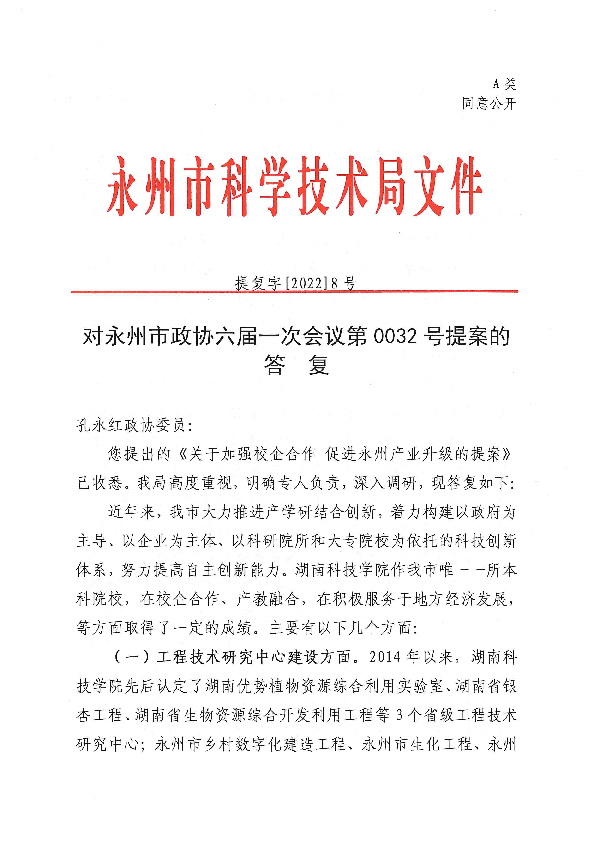 对永州市政协六届一次会议第0032号提案的答复_建议提案_市科学技术局_永州市人民政府