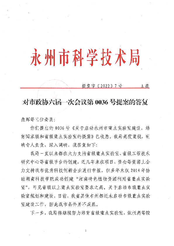 对市政协六届一次会议第0036号提案的答复_建议提案_市科学技术局_永州市人民政府